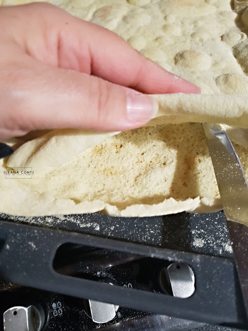 Sfornare e con un coltello ben affilato tagliare ai bordi per suddividerlo in due sfoglie. State attenti perchè è molto caldo e pericoloso.