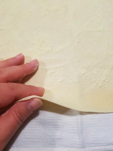 Stendere l'impasto con il mattarello in modo da formare dei cerchi sottili con spessore di 2 mm (il diametro dovrà aggirarsi attorno ai 40 cm). Sistemare i cerchi uno sopra l'altro separandoli con dei teli e terminare con un telo e un peso (io ho usato un tagliere di legno) per evitare che si deformino.