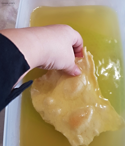 Sciogliere su frammentu in acqua tiepida e mescolarlo a un paio di cucchiai di farina e formare una pallina grande quanto un pugno.